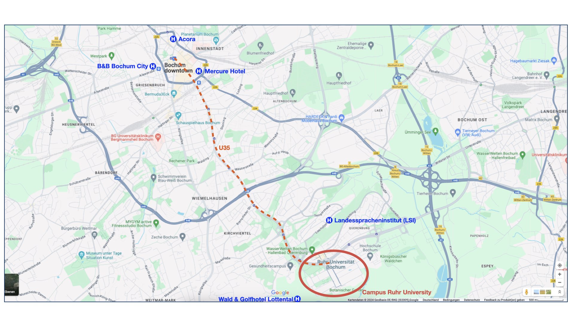 The Mercure Hotel is conveniently located in the downtown area about 200 meters away from the Main Station (Bochum Hbf). From there, the university can be reached in about 10 minutes using the U35 subway line.